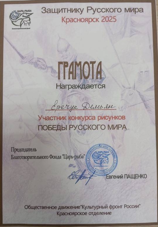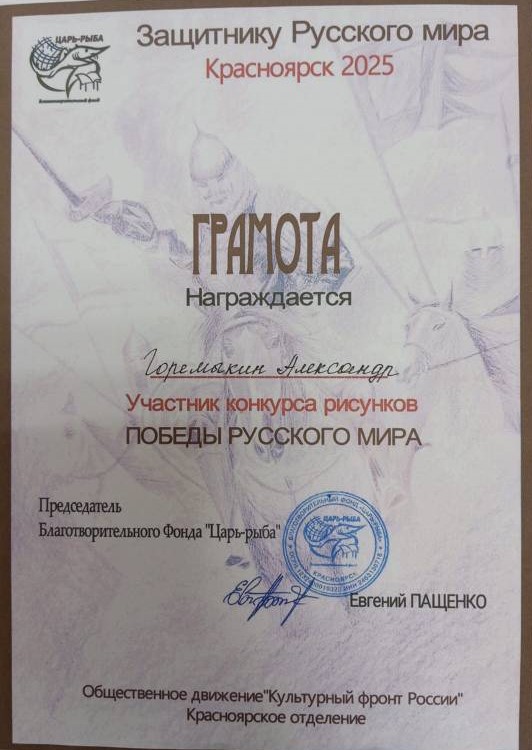 Диплом конкурс рисунков "Победы Русского мира!" Горемыкин Саша, Еричук Демьян